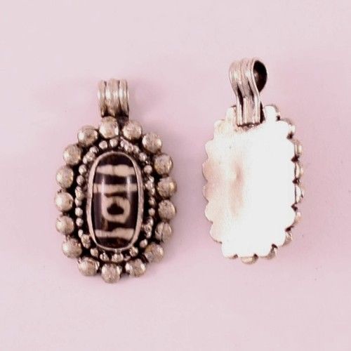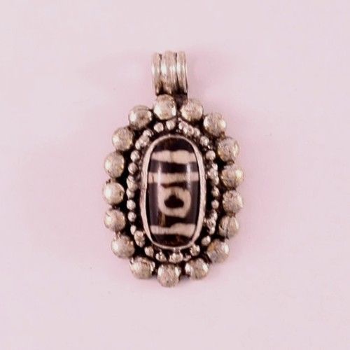 Vintage Tibetan Silver Dotted Edge One Eye Agate dZi Bead Amulet Pendant -
