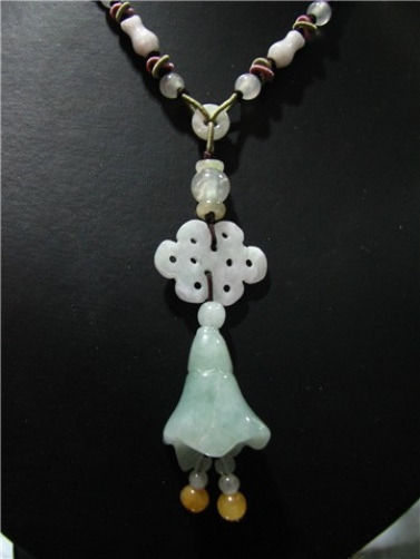 carved jadeite jade trumpet flower as the center pendant, with two jade beaded