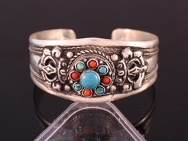 Huge Tibetan Turquoise Red Coral 9 Gemstone Carved Big Vajra Dorje Cuff Bracelet
