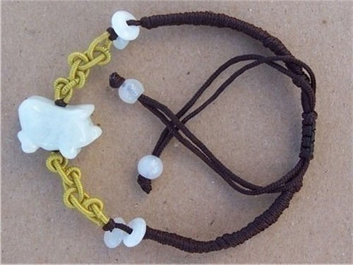 hand-knotted jade bracelet with premium silk brown cords. The cords are knotted