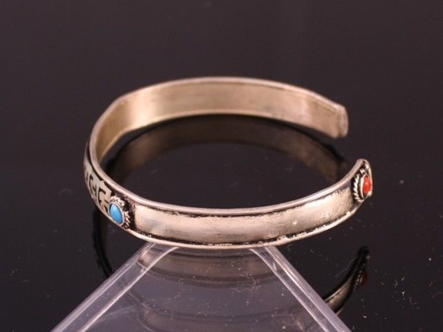 Tibetan 4 Turquoise Red Coral Gemstone Carved OM Mani Padme Hum Cuff Bracelet
