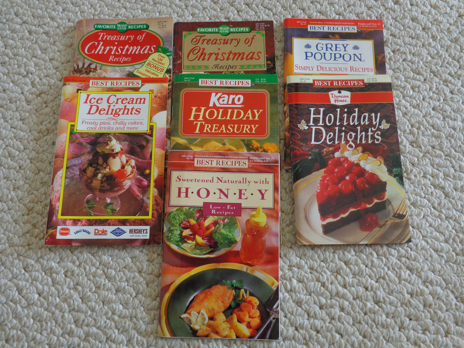 This is a Collection of 7 Cookbooks, 2 are Favorite Brand Name Recipes and the Other 5 are โBest Recipes.(#0751) They are Ice Cream Delights, Grey Poupon, Karo Holiday Treasury, Holiday Delights, Sweetened Naturally with Honey, and 2 Treasury of Christmas Recipes. Dating from 1993 to 1997 all by Publications International, Ltd. in Lincolnwood, Illinois. Each recipe is beautifully illustrated with pictures and clear instructions for the recipes. Complete with Quick tips. These cookbooks are in excellent condition, no missing, creased or bent pages. Please see pix for complete description.