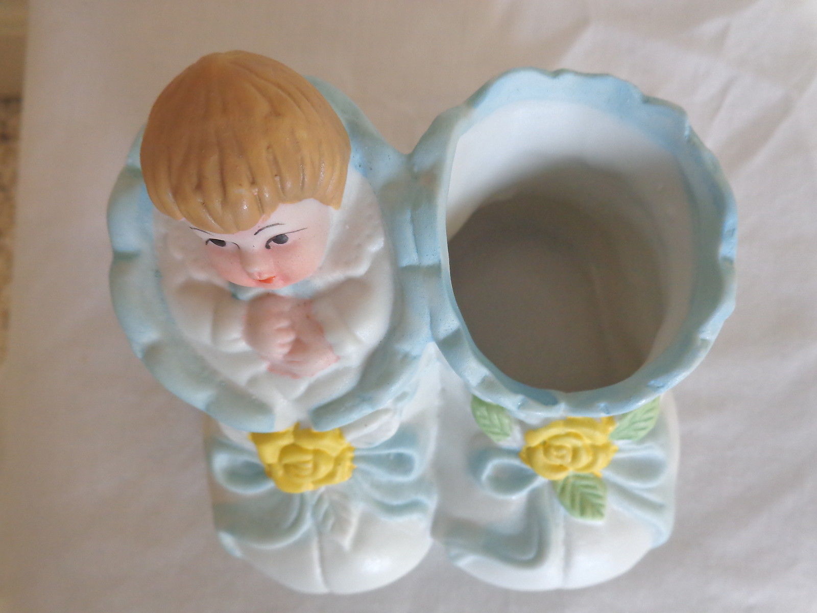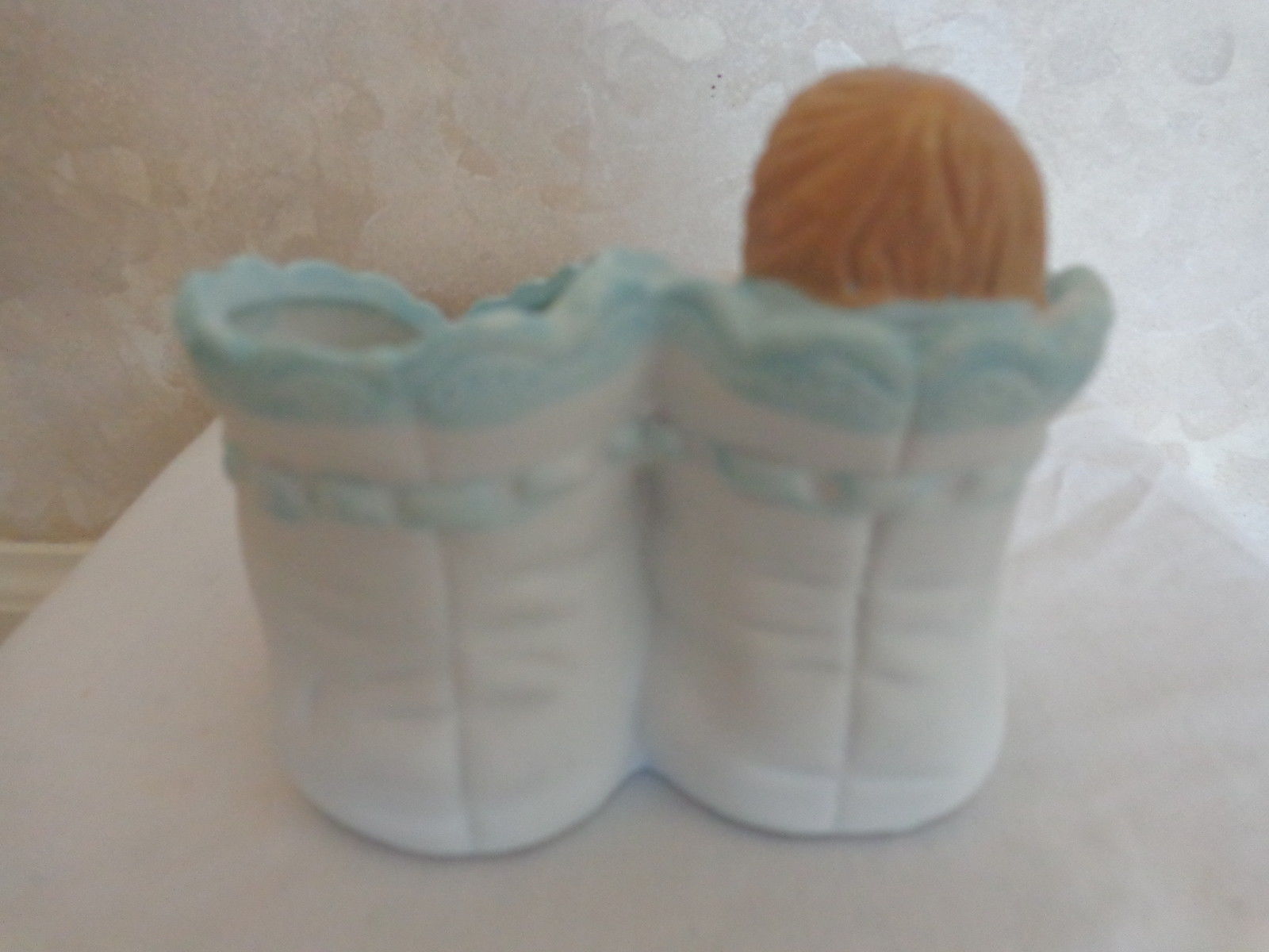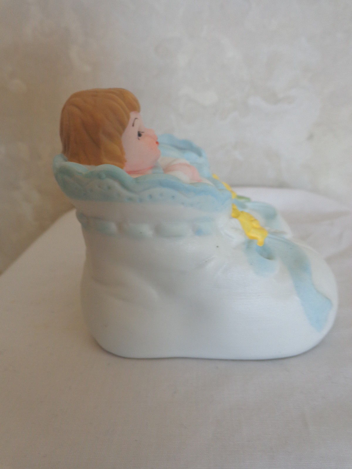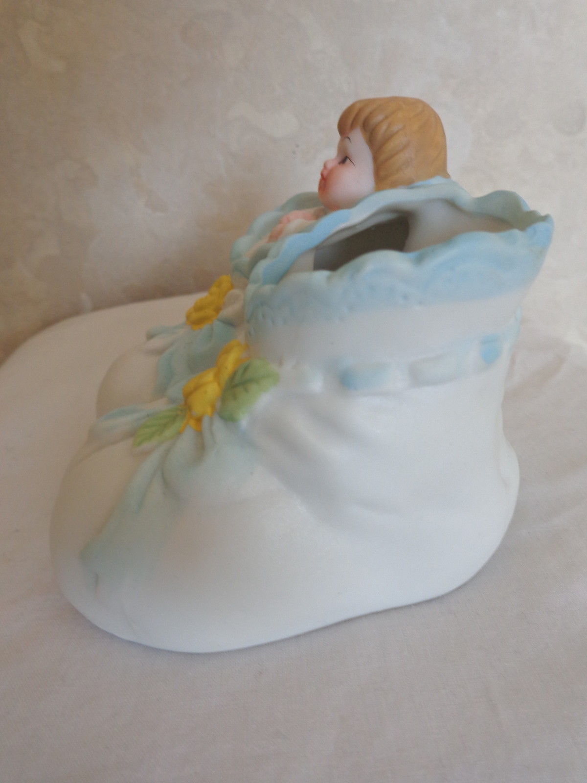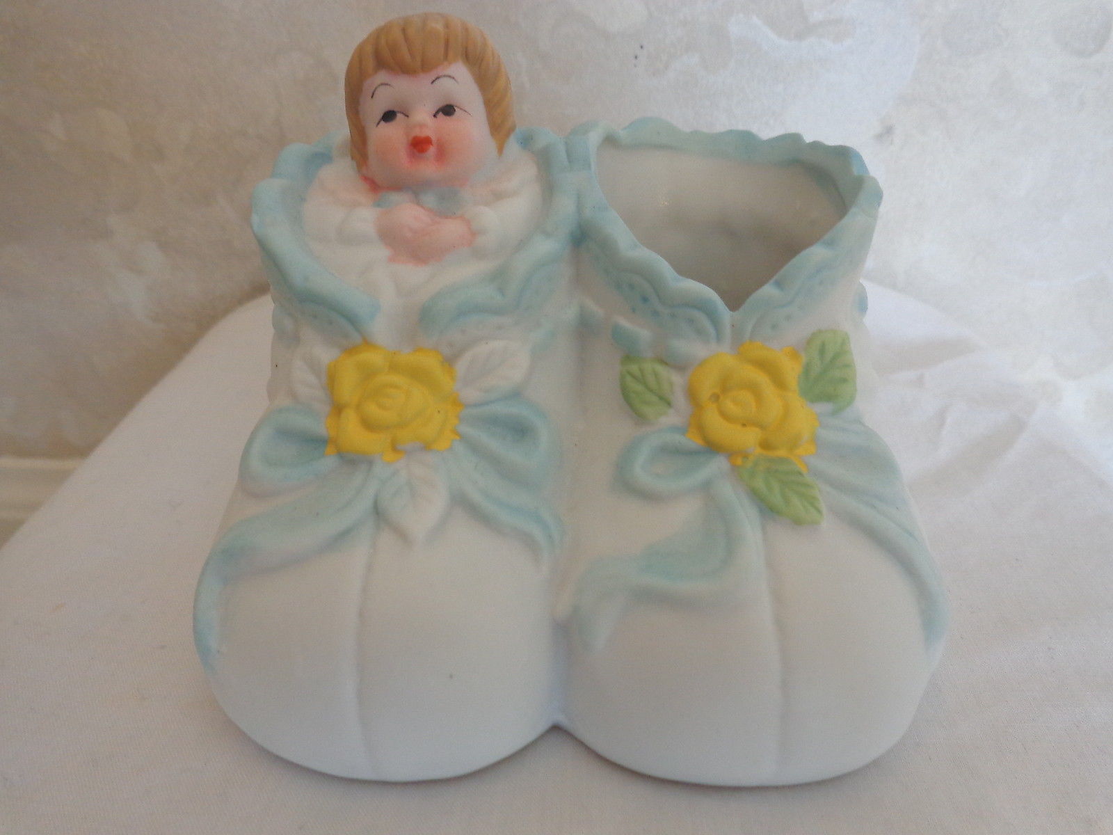 This is a CERAMIC BABY BOOTIE MINIATURE PLANTER COLLECTIBLE (1580). It has an adorable baby in swaddling in one side and the other is open for a small plant, candy, etc. It is white, decorated with blue ribbon and bows, with yellow flowers. It is perfect for a baby shower decoration or on a cake. It measures 3 inches wide by 3 1/8 deep and stands 3 inches tall. And was made in China. It is in excellent condition, no chips or cracks of any kind. (Pease see pix, for complete description)