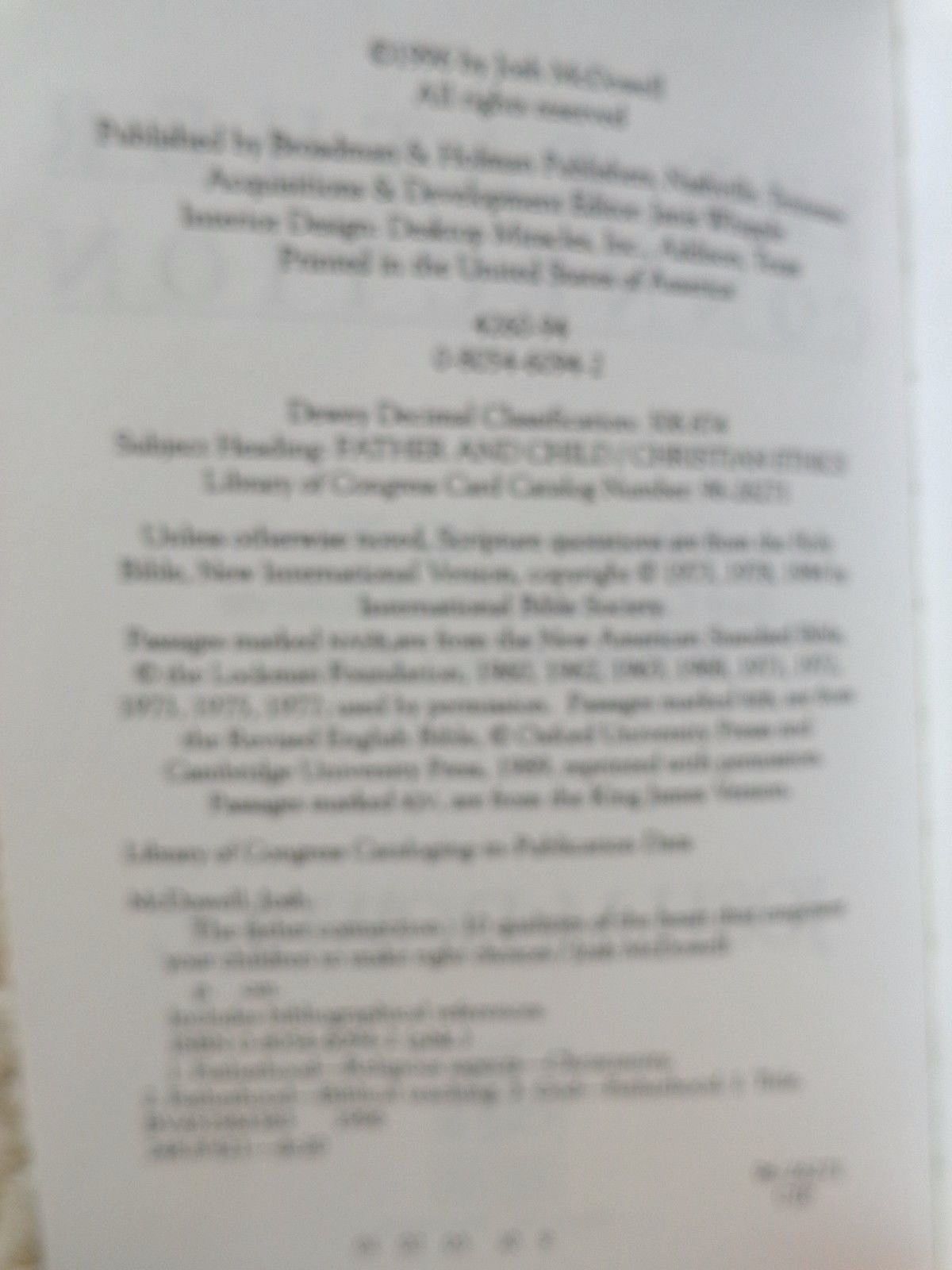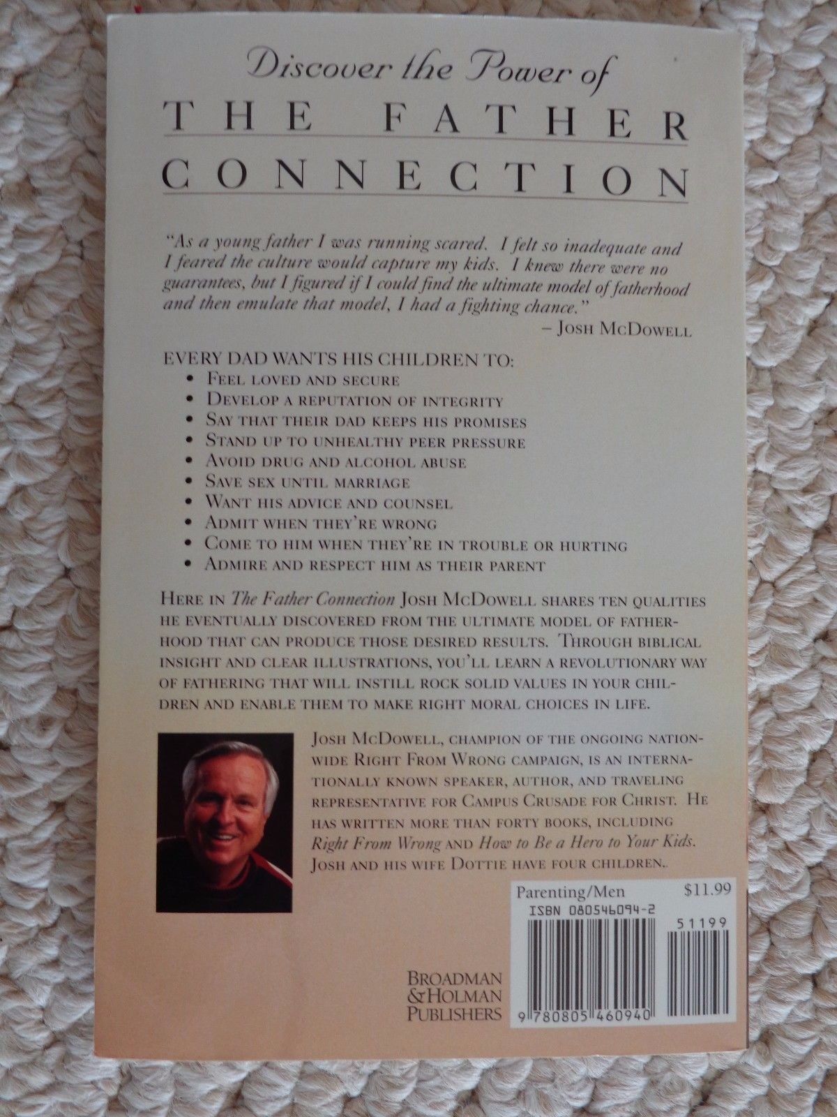This is the Book: The Father Connection by Josh McDowell, ISBN: 0805460942. Copyright 1996. All scripture quotations, unless indicated, are taken from the Holy Bible, New International Version. Published by Broadman Holman Publishers, Nashville, Tennessee and Printed in the United States. The book is in very good condition. No missing or tearing of pages. (Please see pix) (#1373)