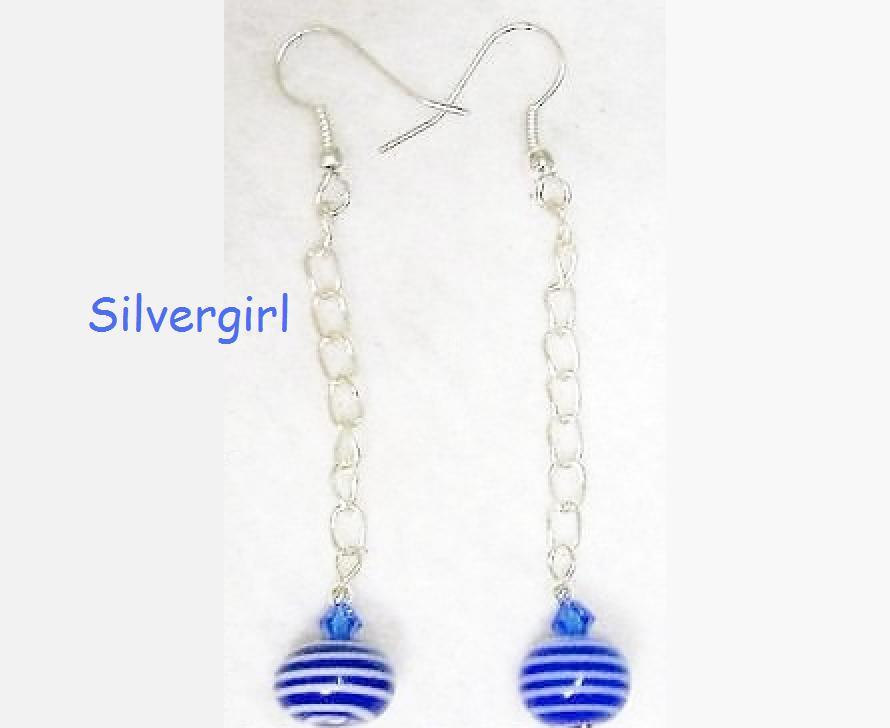 This is a pair of lovingly crafted 2 5/8" earrings. I have used a 10mm royal blue colored lamp work glass bead with white swirls and hung these from silver plate chain. And topped them of with some shiny surgical steel silver plate hooks.
