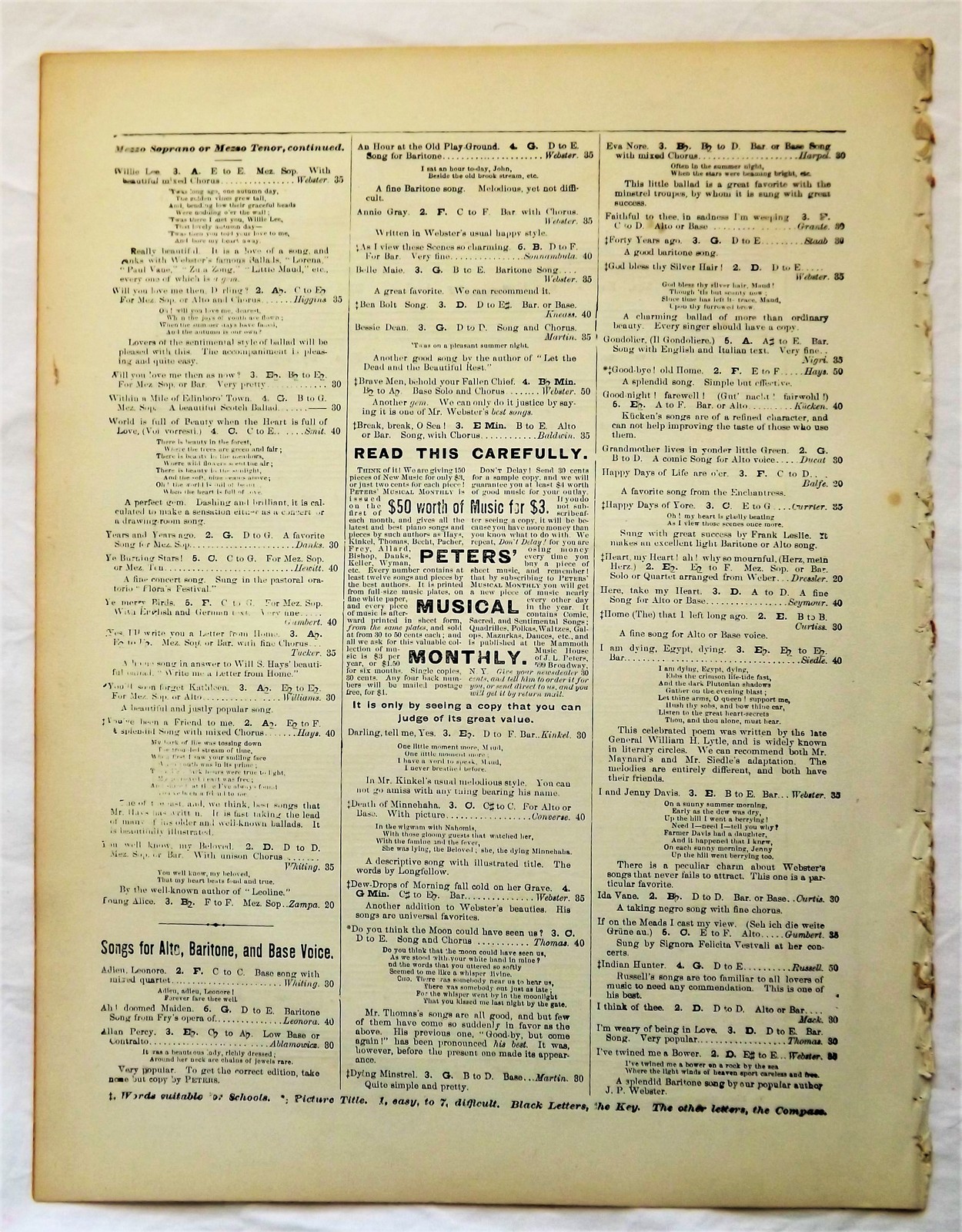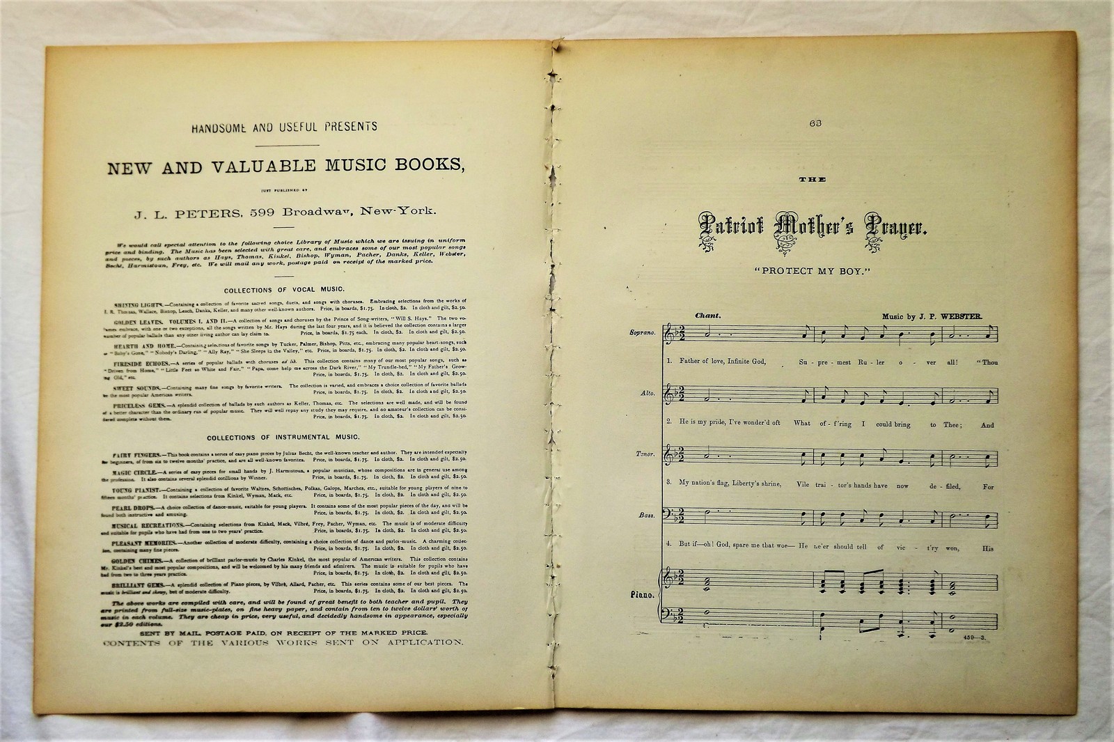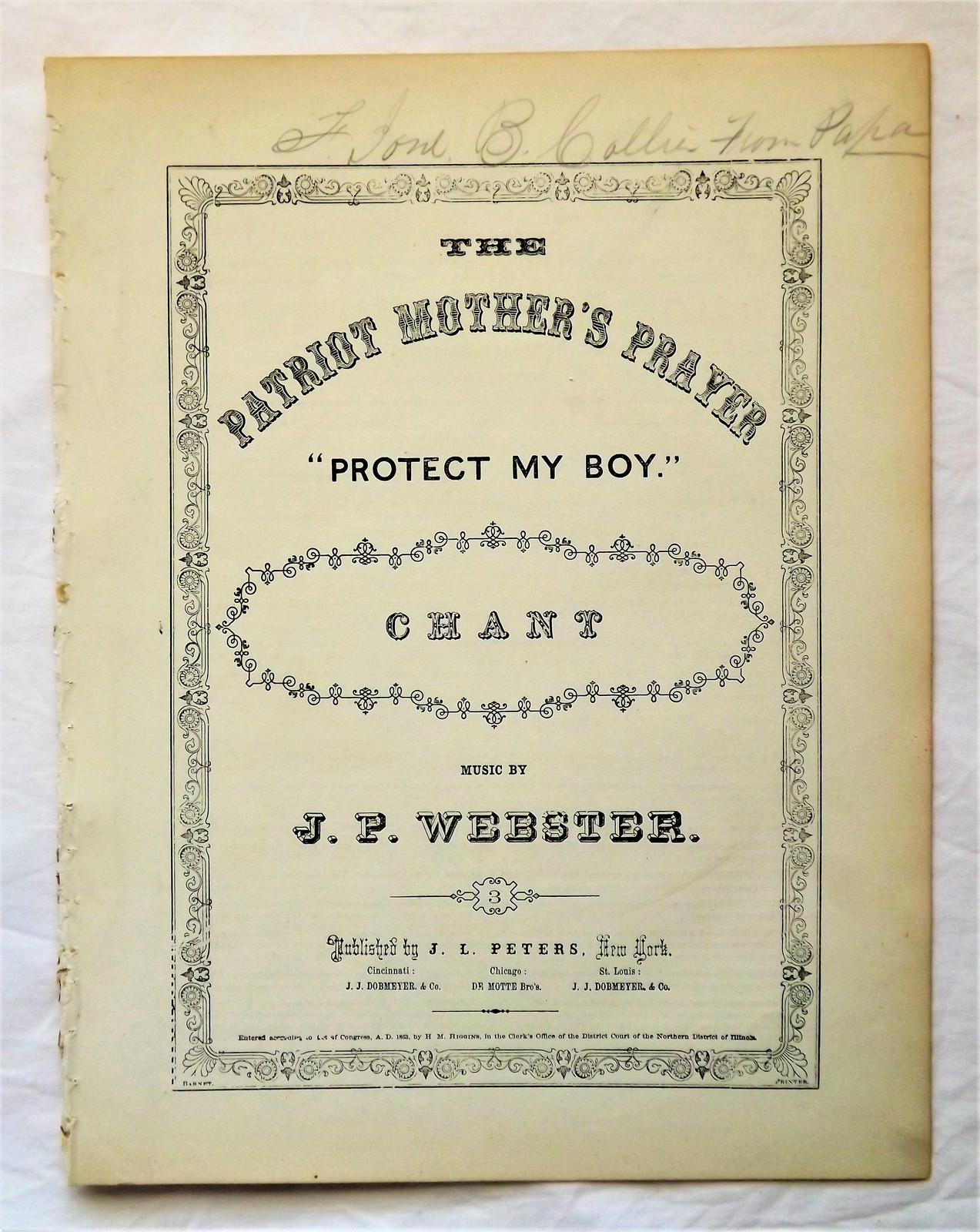 An 1863 Civil War Sheet Music Piece entitled; The Patriot Mother's Prayer "Protect My Boy." Written by J.P. Webster and Published by J.L. Peters of New York. This piece is commonly associated with the Union side of the Civil War and is in exceptionally fine condition, possibly due to spending most of its life protected within a bound volume of accumulated sheet music, as was a common practice during the late 19th century. There are no tears, stains, nor foxing present on any of the pages. There is a name written in pencil across the top of the front page. This piece may have also been trimmed about half an inch when it was previously bound, as it currently measures 13.5" x 10.5" instead of the standard 14" x 11". THE PRICE OF THIS ITEM HAS BEEN REDUCED TO HELP MY ELDERLY NEIGHBOR SAVE HER HOME AND STOP IT FROM BEING TAKEN AWAY FROM HER IN A FORECLOSURE SALE THIS MONTH!!!!
