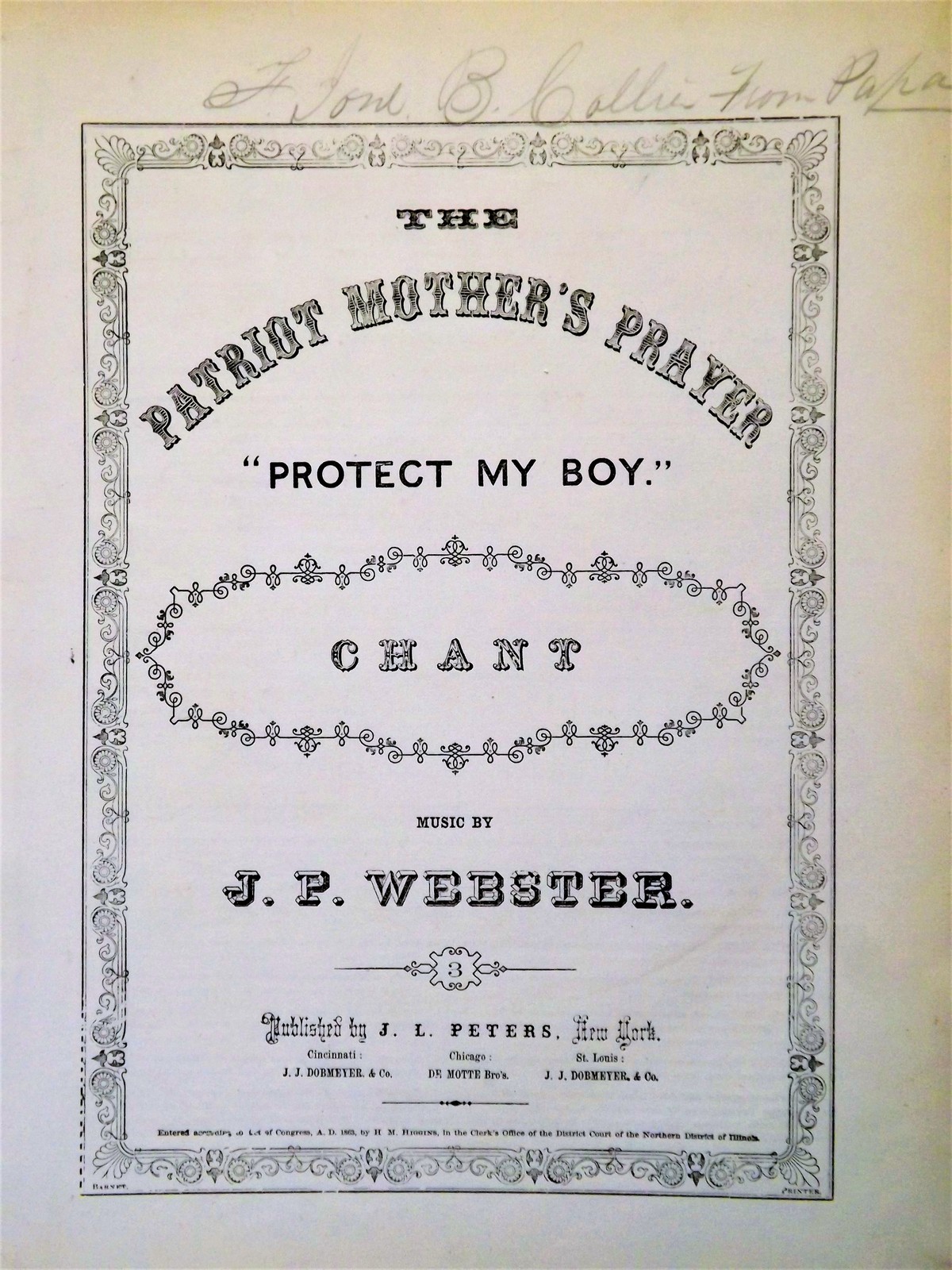 1863 The Patriot Mother's Prayer "Protect My Boy" Civil War Sheet Music Webster