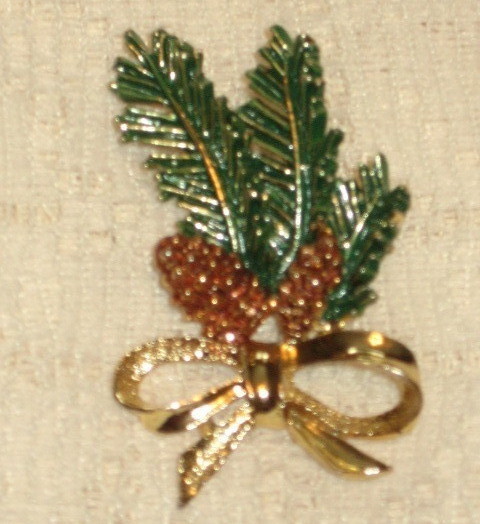 From the 1980's and designed by Gerry's, this enamel Christmas pin has evergreen boughs and two brown pinecones. The gold tone ribbon ties everything together. A hinged stick pin one the back has a safety closure. Measures 2 " across