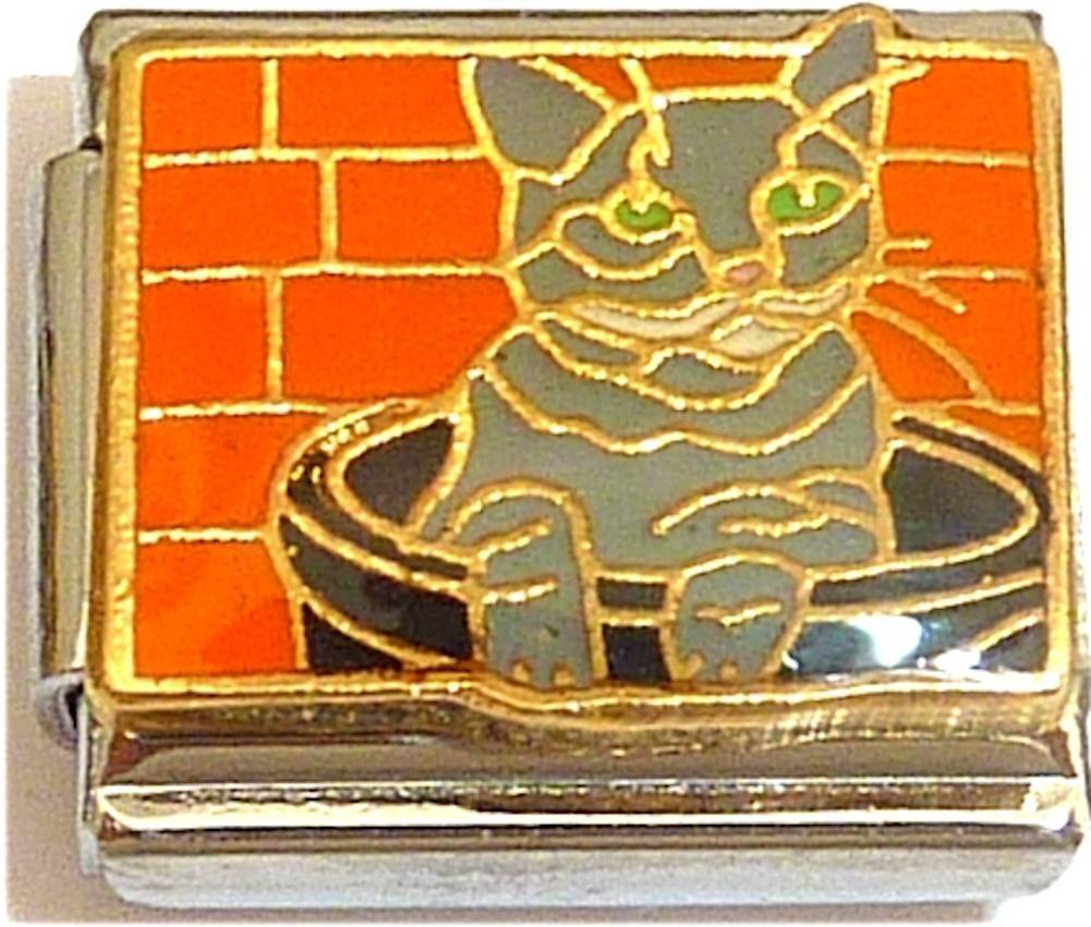 Gray Cat In Bowl Italian Charm Bracelet Jewelry Link. This hiqh quality Italian Charm is compatible with our entire Italian Charm line as well as with all other major brands. Start with a few unique designs and build up to a full bracelet of unique charms over time. These charms and the bracelets they create make great gifts for a birthday, graduation, Mother's Day, and more.