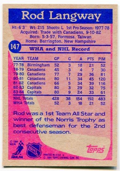 1984/85 Topps Rod Langway Card #147 Washington Capitals