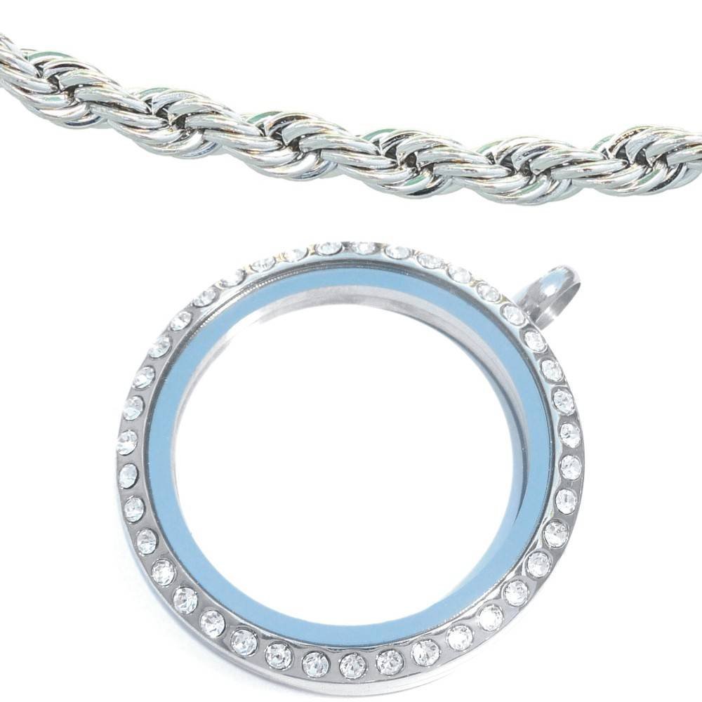 Stainless Steel Silvertone Big Round Magnetic CZ Locket with 20 Inch Rope Silvertone Necklace