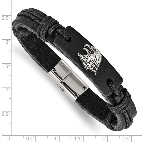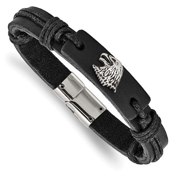 Stainless Steel Antiqued & Polished Eagle Head Black Leather Bracelet