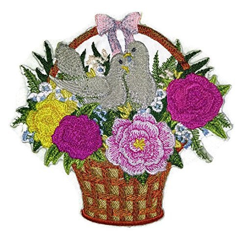 Lovebirds with Basket embroidery patch. Absolutely superior quality patches which can be ironed or sewed on any garment. This patch is made of the finest embroidery thread and cotton base. Finest quality money can buy. Steps to iron it on the garment are listed below: 1. Set Iron to Cotton 400 degrees, for one minute. 2. Thoroughly iron area of garment where patch will be placed. 3. Spray water lightly on the back. Position your patch where you desire, Place it on garment, embroidery facing up. 4. Place cloth or light towel over patch and using a slow circular motion, press firmly for 30 seconds. 5. Turn garment inside out, and iron the back of the the patch for 30 seconds. 6. Let cool for one minute. If edge of patch can be lifted, repeat step 5.
