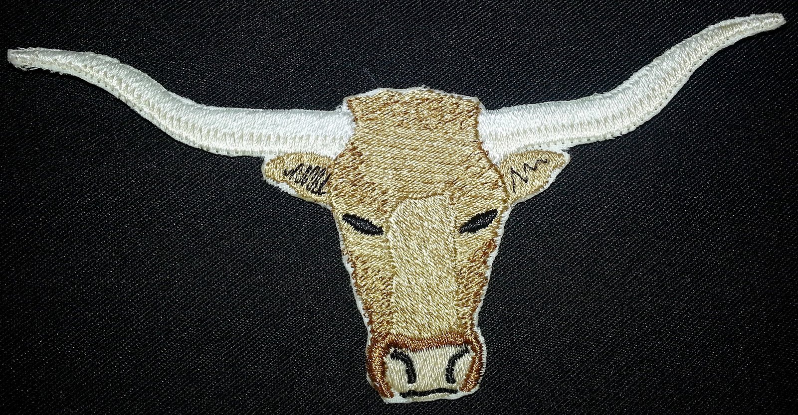 Custom Longhorn embroidery patch. Absolutely superior quality patches which can be ironed or sewed on any garment. This patch is made of the finest embroidery thread and cotton base. Finest quality money can buy. Steps to iron it on the garment are listed below: 1. Set Iron to Cotton 400 degrees, for one minute. 2. Thoroughly iron area of garment where patch will be placed. 3. Spray water lightly on the back. Position your patch where you desire, Place it on garment, embroidery facing up. 4. Place cloth or light towel over patch and using a slow circular motion, press firmly for 30 seconds. 5. Turn garment inside out, and iron the back of the the patch for 30 seconds. 6. Let cool for one minute. If edge of patch can be lifted, repeat step 5.