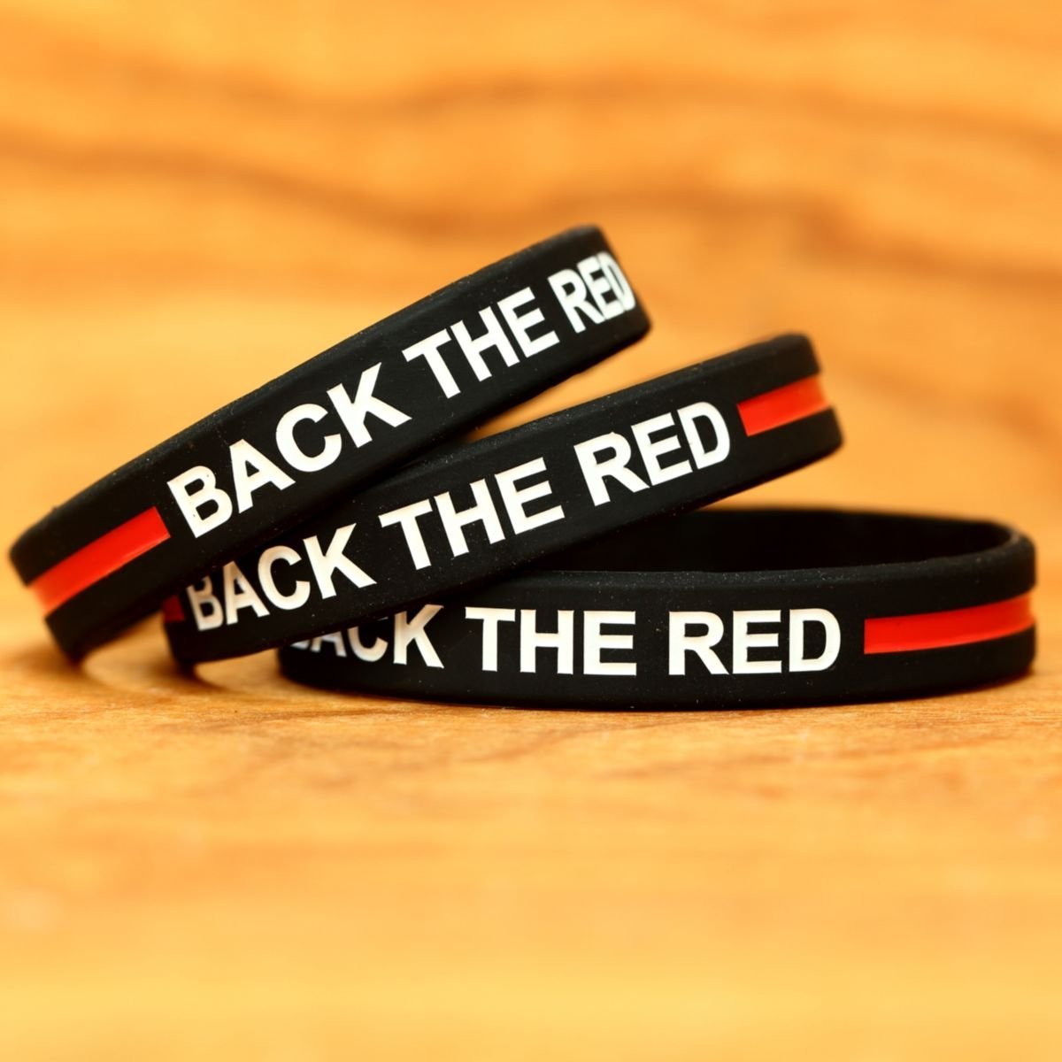 Back the Red message on high quality thin red line silicone wristbands. The message on these bands is clear and bold. The text on these wristbands is debossed and color filled using a two-step process. Using a custom mold we first create bands with indented text and/or images for you. Then we paint fill those locations so your custom design is recessed below the top of the bands. The result is a better looking and much longer lasting wristband (compared to screen printed and other types of color text bands).