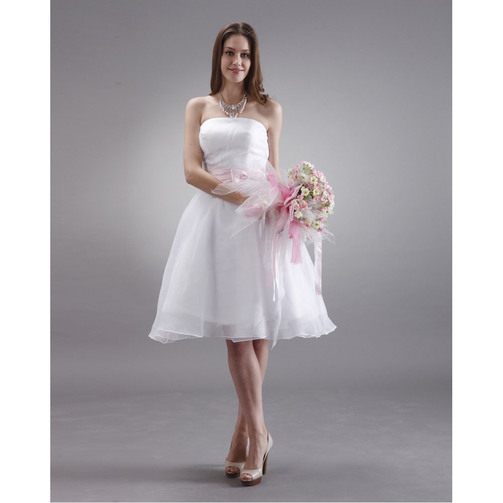 Strapless short knee length skirt with pink sash and bow, it can also be used for prom dresses, bridesmaid resses, cocktail dresses, party dresses, birthday dresses, beach dresses, bridal reception dresses, holiday dresses etc. Back is half lace up + half zipper.