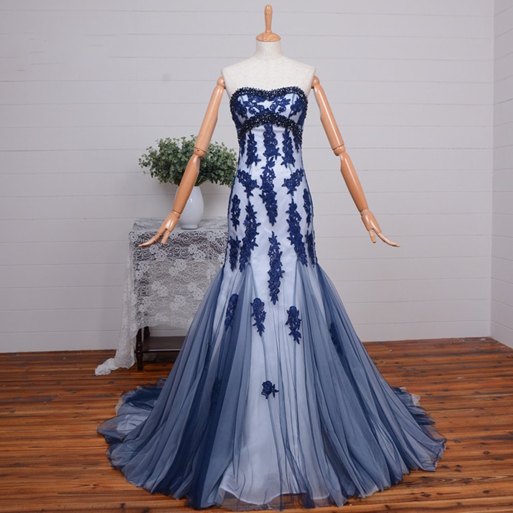 Fabric is tulle, Back is lace up not zipper, Sweetheart sexy trumpet long skirt with court train, Elegant beading sequns, Lace appliques, White and Black, White and Navy Blue color mixed. Plus size available.