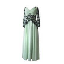 Chiffon v neck with sheer long sleeves and black lace appliques, it can also be used as prom dresses, evening dresses, holiday dresses, party dresses, mother of the bride dresses, women formal gowns, ladies dresses, bridesmaid dresses etc. Back is lace up not zipper.