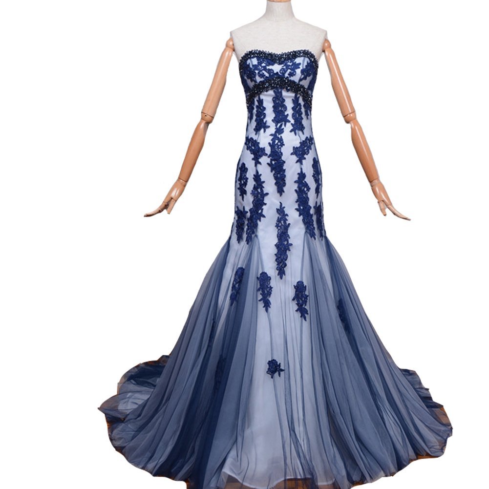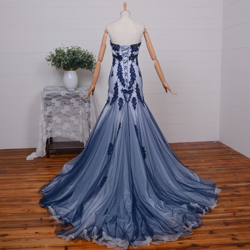 Fabric is tulle, Back is lace up not zipper, Sweetheart sexy trumpet long skirt with court train, Elegant beading sequns, Lace appliques, White and Black, White and Navy Blue color mixed. Plus size available.