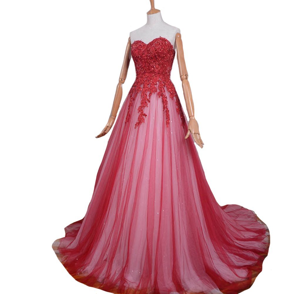 Fabric is tulle, Back is lace up not zipper, Sweetheart A line skirt with court train, Fashion royal blue/red and champagne color mixed, Shiny beaded sequins lace appliques, Plus size available