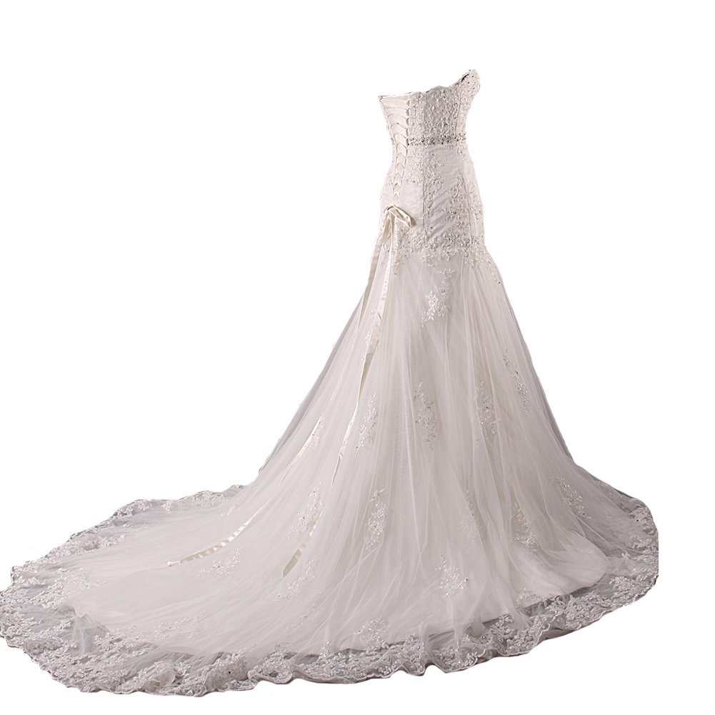 Tulle strapless mermaid bridal wedding dresses, Lace appliques, Beaded sequins, Back is lace up corset back