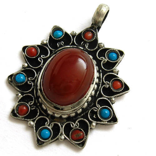 Big Tibetan White Copper Turquoise Red Coral 9 or 10 Gemstone Heart Edged Amulet Pendant