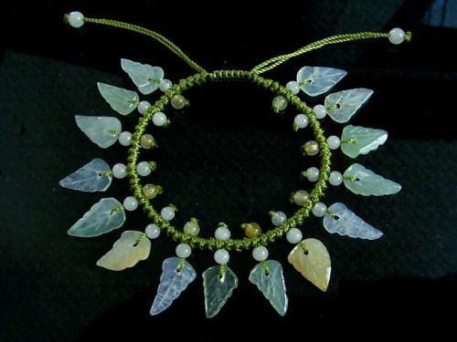 Adjustable hand-knotted jade bracelet with premium green silk cords. The cords are knotted in an exquisite design: 15 jadeite jade leaves evenly hand-knotted along the string cord through 30 small round jade beads (1 leaf 2 round jade beads knotted together, these 15 jade leaves are mostly white or white with light green, or light yellow, not as greenish as the picture shows, though). Very lovely beautiful!