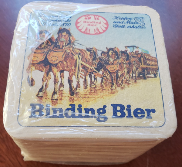 Binding Bier Cardboard coasters, brand new. Features a ceremonial horse-drawn wagon, an impressive sight!Binding Brauerei AG is a brewery in Frankfurt founded by Conrad Binding in 1870.