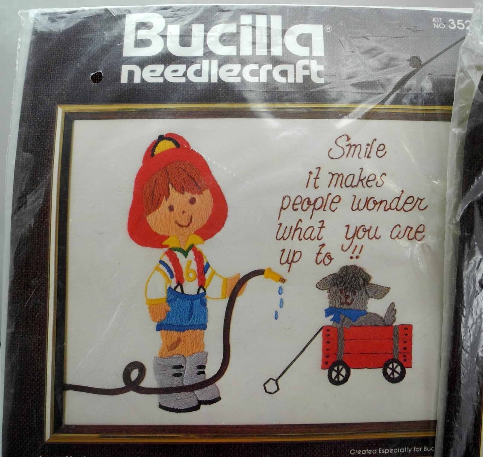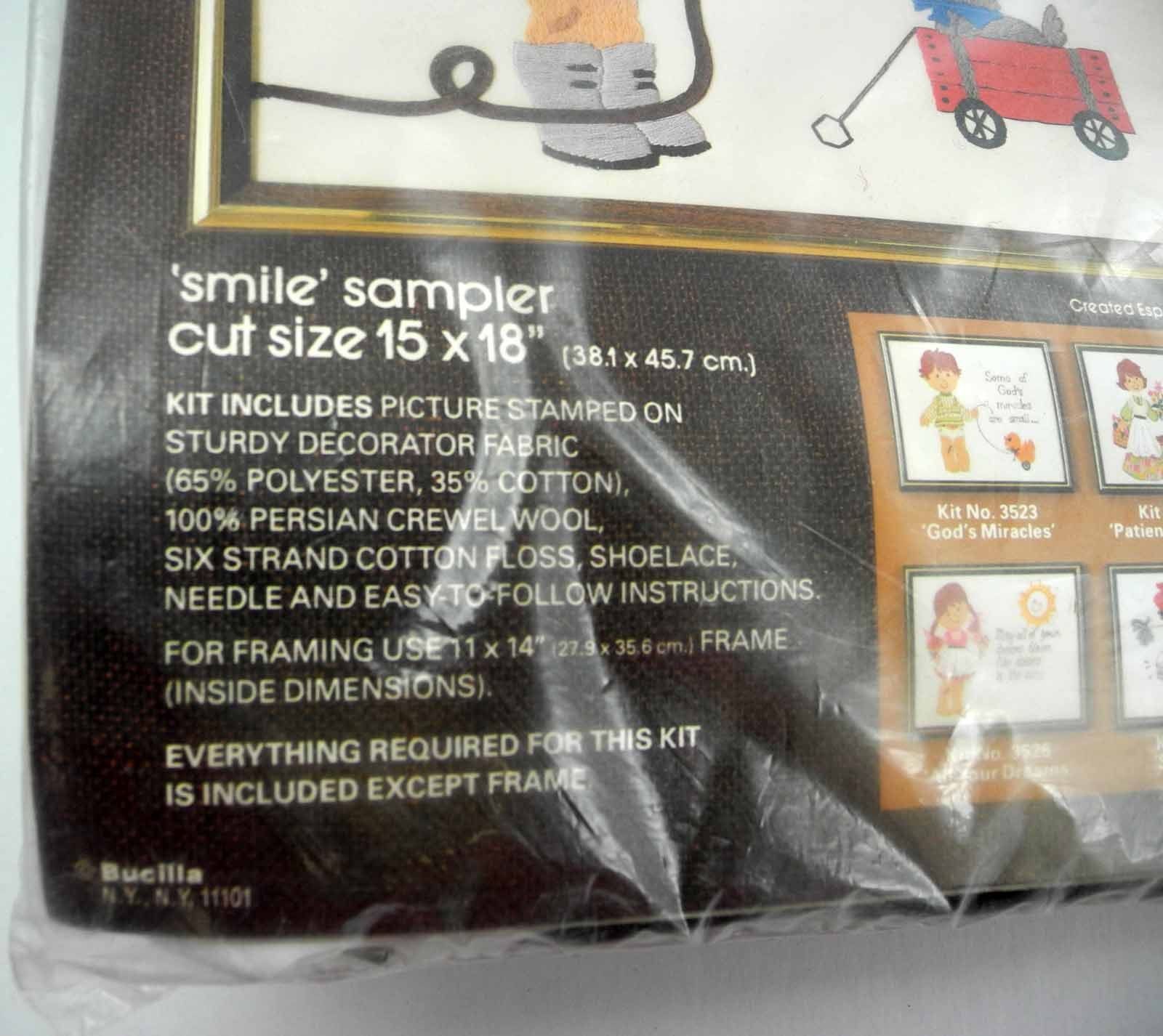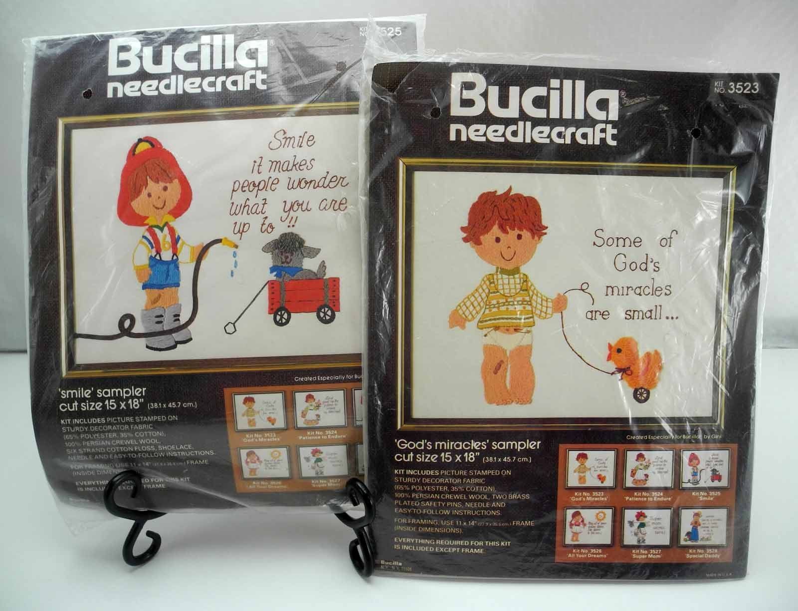 Two vintage sampler crewel kits by Bucilla Needlecraft. "Smile" Sampler kit is new and factory sealed in package. Plastic packaging has sticker residue, shows some wear. "God's Miracles" Sampler kit has been opened but is new and complete. Needle has rusted on fabric, but outside of sampler area. Please see the pictures for all the details.