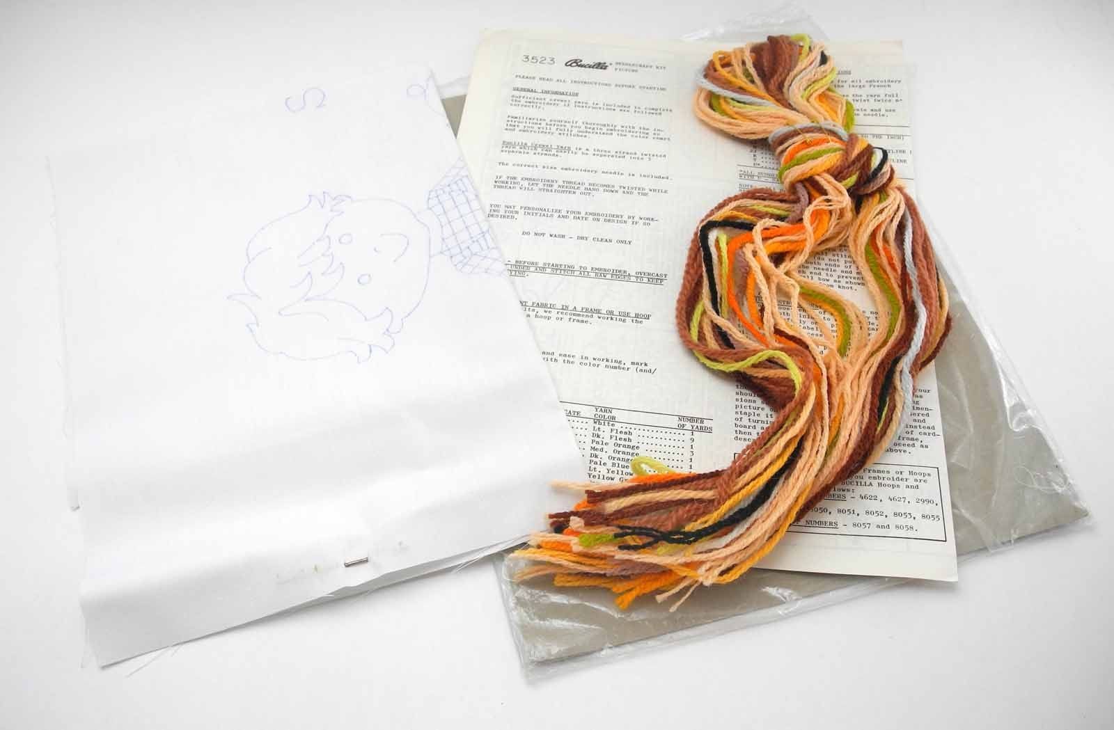 Kits include picture stamped on sturdy decorator fabric (65% polyester, 35% cotton), 100% Persian crewel wool, needle and easy-to-follow instructions.