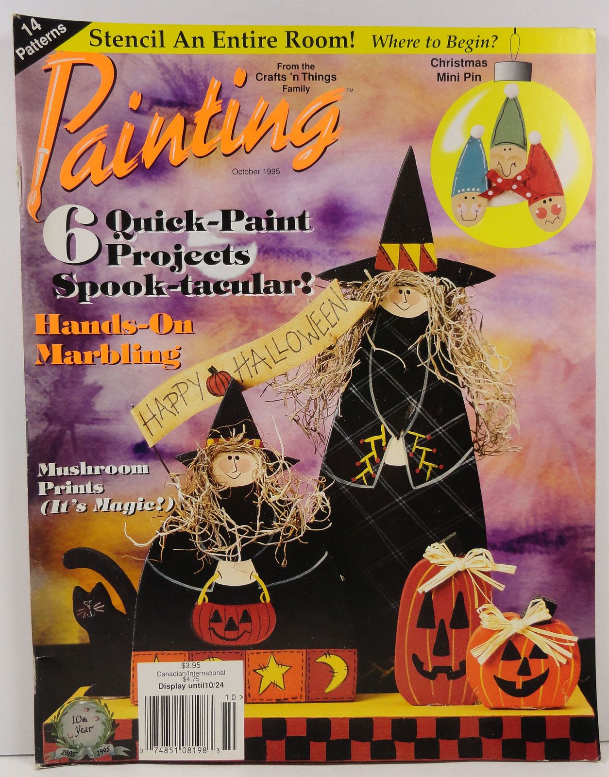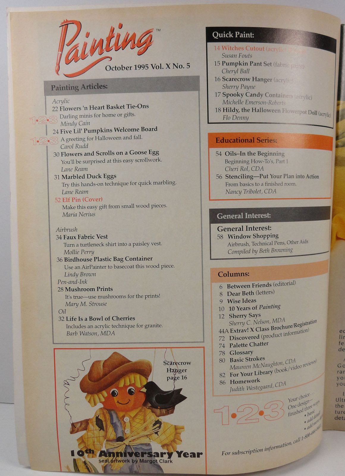 This issue of Painting magazine contains articles Flowers 'n Heart Basket Tie-ons, Five Lil' Pumpkins Welcome Board, Flowers and Scrolls on a Goose Egg, Marbled Duck Eggs, Faux Fabric Vest, Birdhouse Plastic Bag Container, Quick Paint Ideas for Halloween, Stencil an Entire Room. (AC)