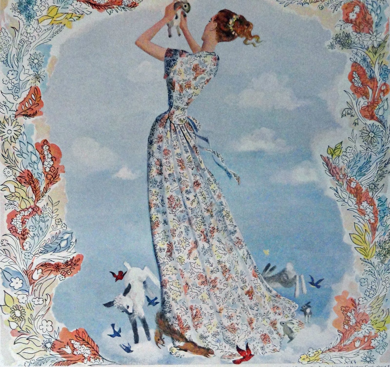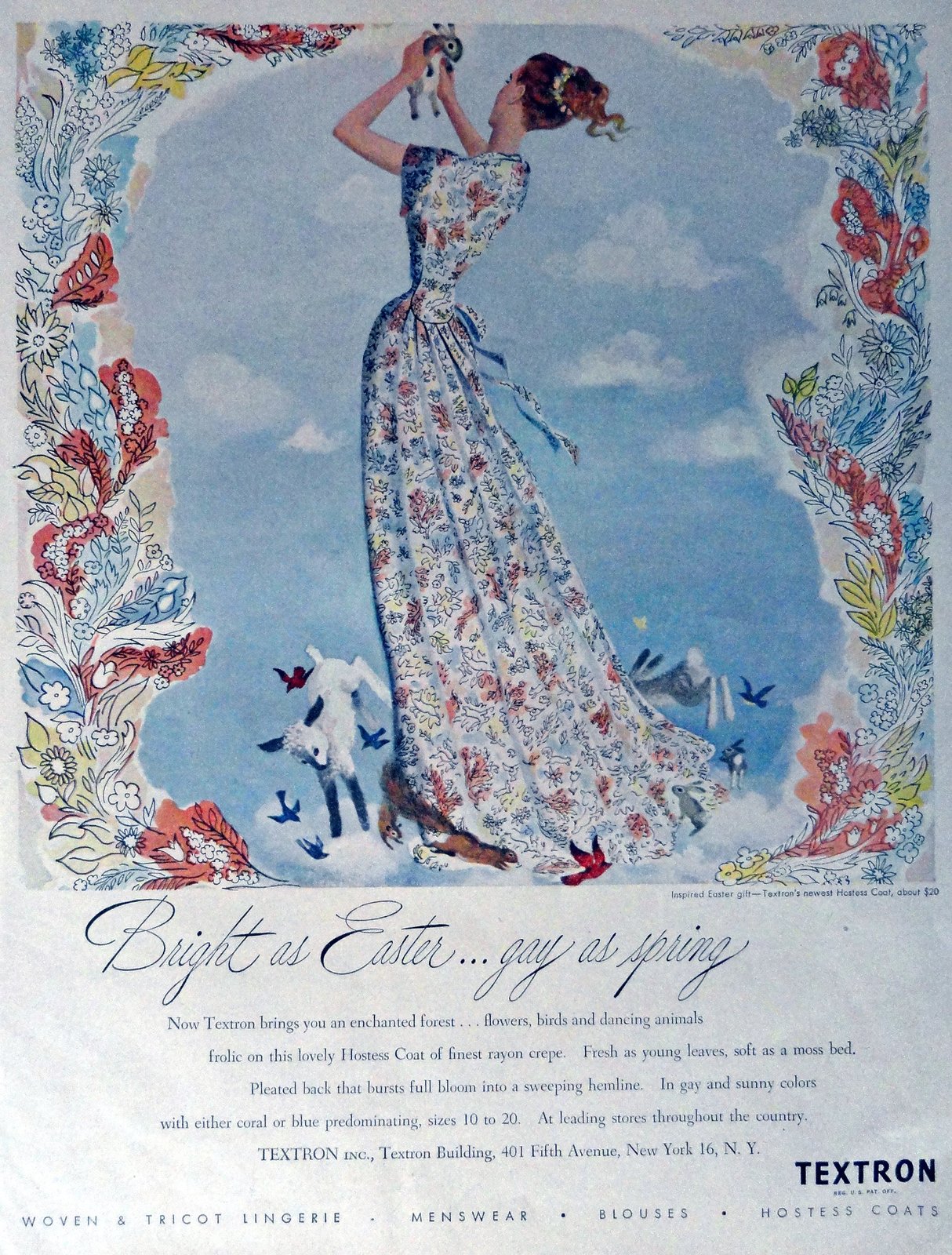 Textron Hostess Coat, 40's Print Ad. Color Illustration (woman sheep,rabbits and