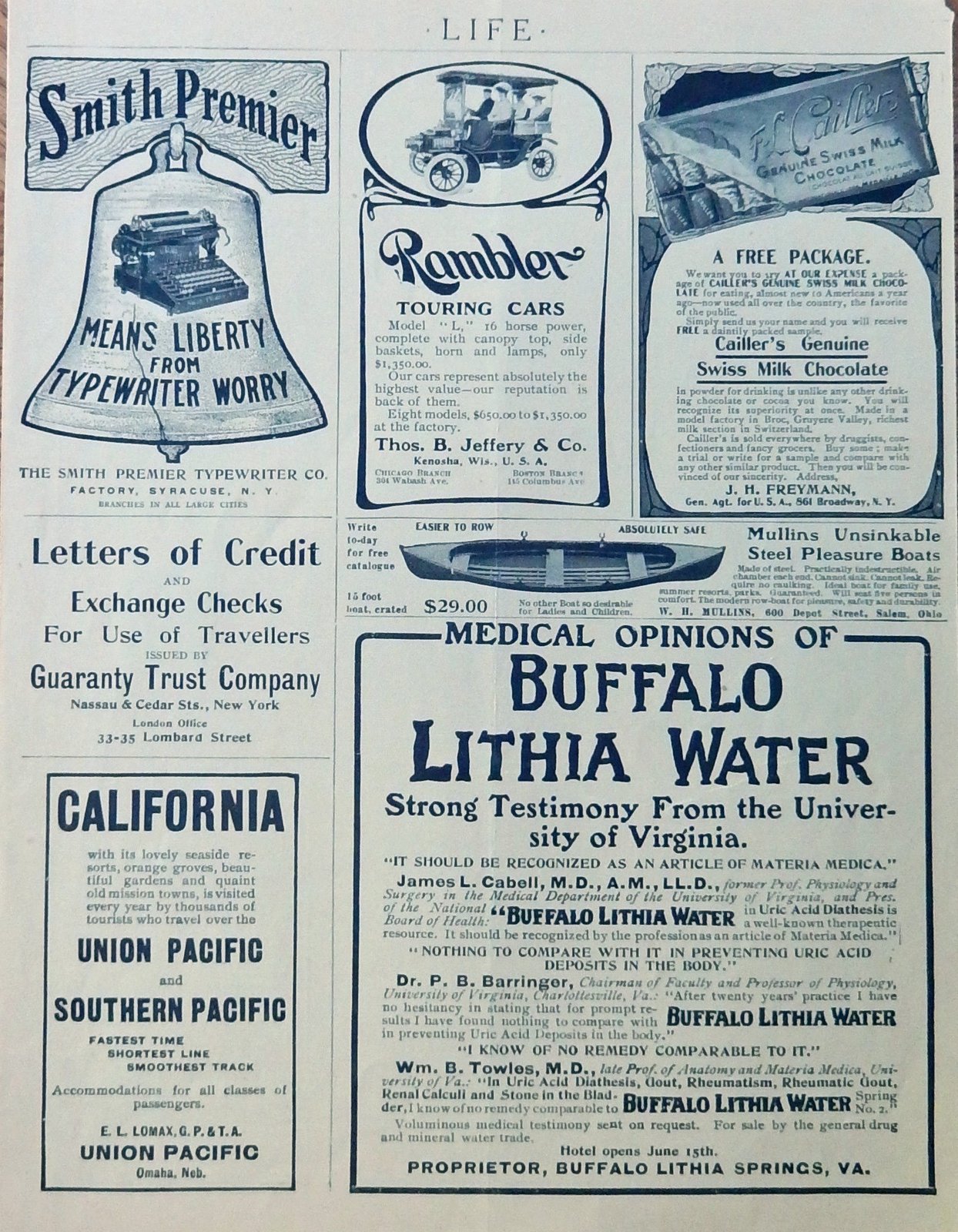 Smith Premier Typewriter, Rambler Car, Buffalo Lithia Water, 1904 print ads. ful