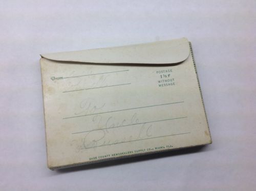 This is a set of 20 mini postcards from Miami they measure 3 9/16 by 2.5 inches there are 5 duplicates that where probably put in from another set for a total of 25 cards. The back of the package says dade county news dealers supply co, Miami Florida, also it says postage 1 1/2 cent without message. It says uncle Russell on the back. The front says Miami, fla, 20 beautiful color views.