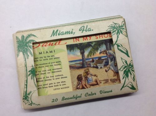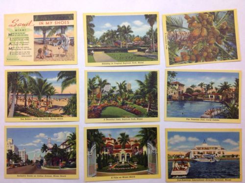 These are published by Curt Teich, ca. 1946. the overall design and the nicely dressed woman emptying the sand from her shoe. Some of the photos have credits of the photographers. Some are G.W. Romer photo, Miami. Hamilton wright, jr, Verne o Williams, wye freeman. From a smoke and pet free home. They are all in mint condition.