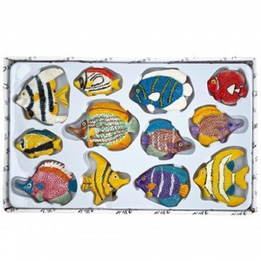 -Great for decorating refrigerators and more, this 12-piece Decorative Fish Magnets Set features detailed, hand painted resin magnets in assorted fish designs.