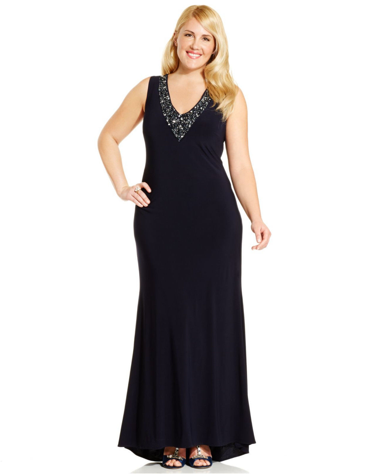 Betsy Adam New Womens Navy Embellished V-Neck Sleeveless Evening Dress.