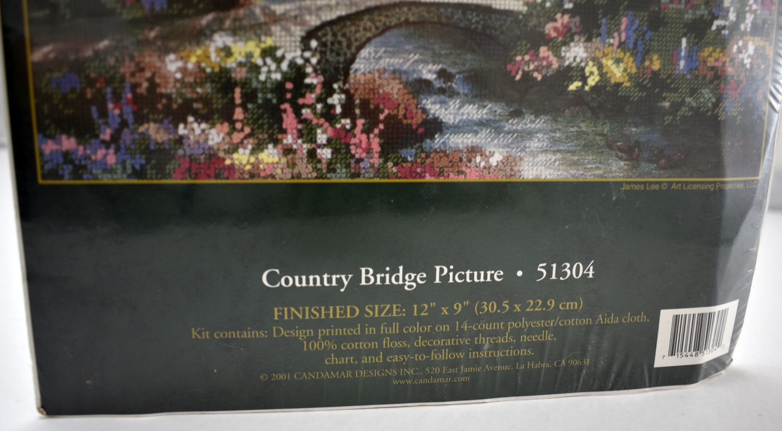 Country Bridge Picture embellished cross stitch kit #51304 by Candamar Designs Inc. New and sealed in package. Designed by James Lee 2001. Full Color printed design quick and easy cross stitch.