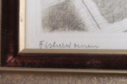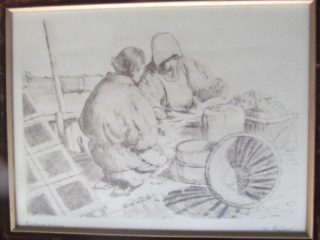 Titled "Fisherwomen", the woodcut etching median is signed by the