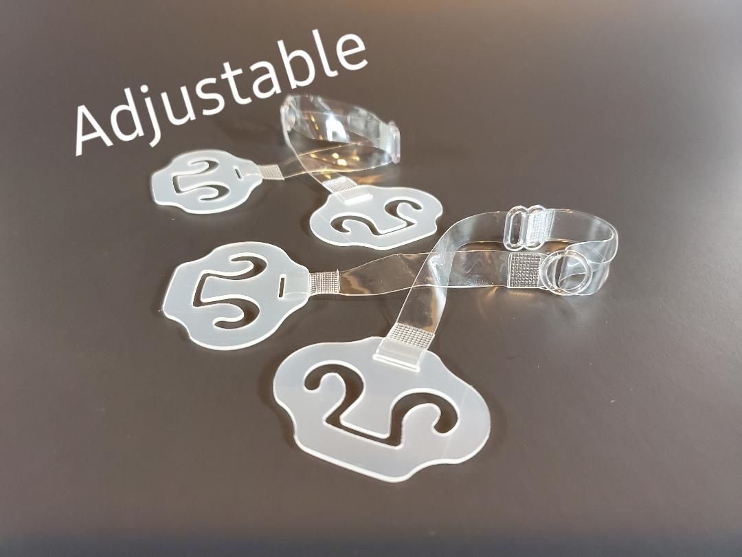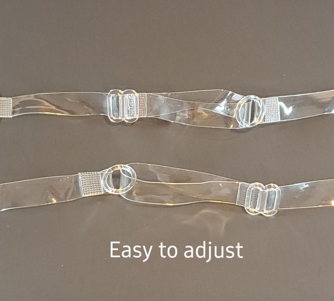 It is comprised of a clear Elastic Strap welded to a three (3) pronged flexible plastic ends which attach to the bra strap.