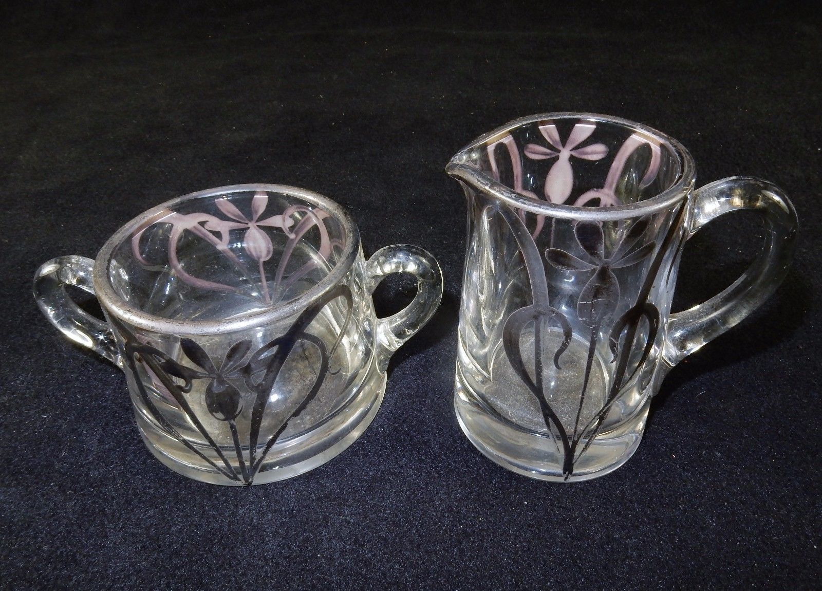 Vintage Heisey Glass Creamer & Sugar, Silver Overlay, Flowers & Hearts Pattern