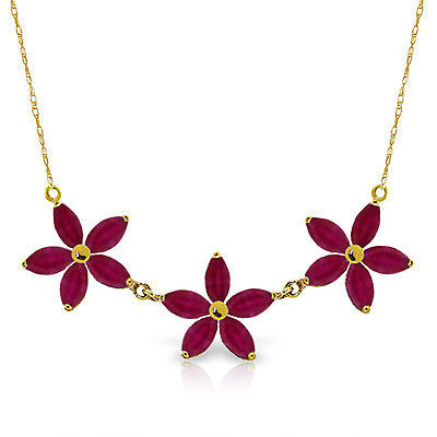Comes with 18" long, 0.68 mm thickness double link Rope Chain.A 14 karat Solid Gold Necklace captures three flowers in full bloom. Petals are lavishly accented with Natural Rubies.. Length options from 14" to 24".
