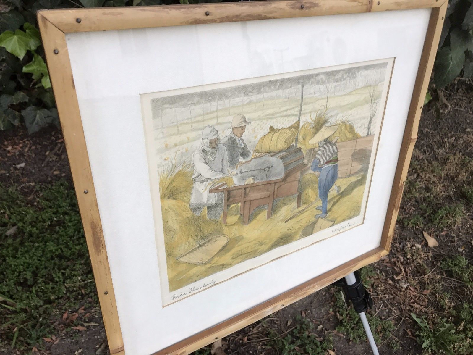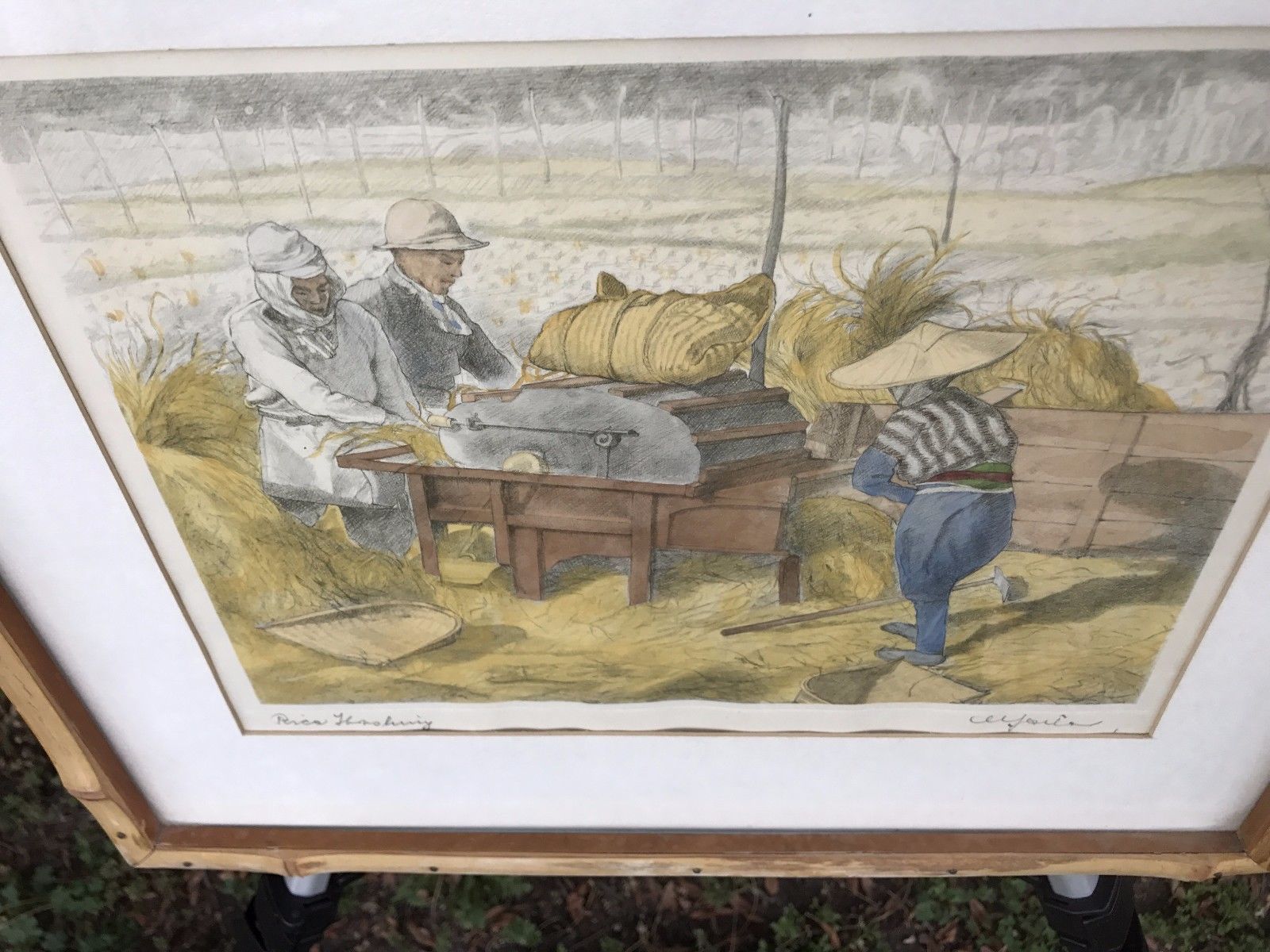 WILLY SEILER Signed Vintage 1950 Hand Colored Japanese Etching "Rice Threshing"