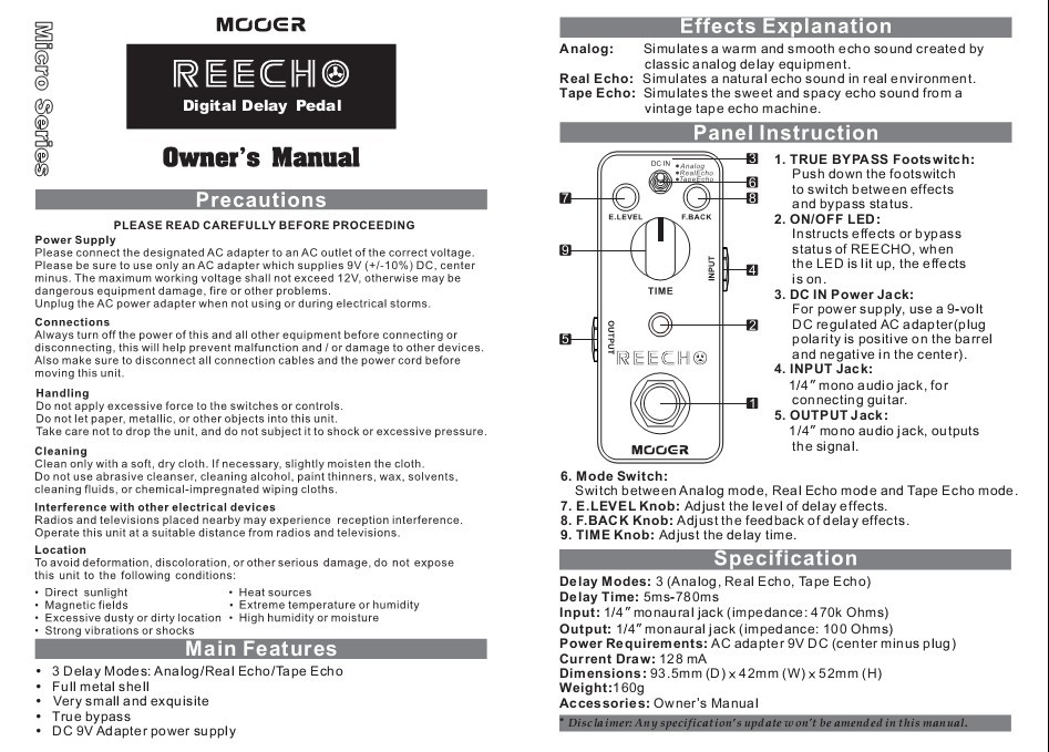 3 Delay Modes: Analog/Real Echo/Tape Echo