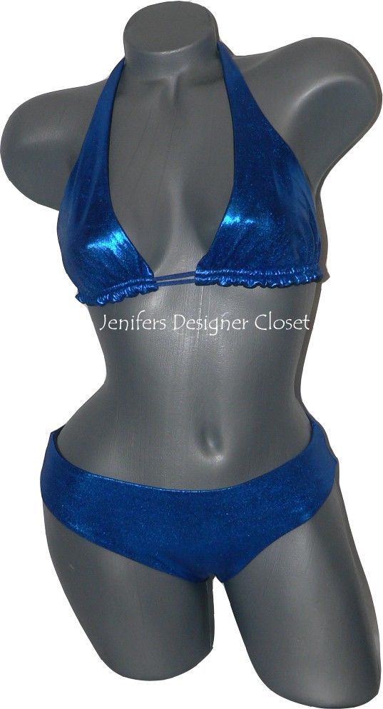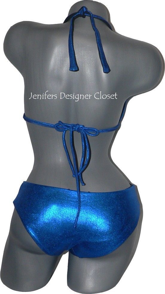 This is a brand new, sexy reversible, bikini swimsuit from high-end designer label FABUCCI. It is a Fabucci size 2 which is approx. US Size Small. Shiny metallic blue looks amazing in the sun and reverses to regular black that is not shiny. Triangle slide top. Retail price is $250.00.