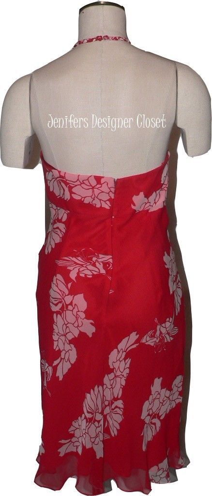 Fully-lined. 100% SILK. Retail Price-$300.00. Red and white floral. Zipper closure with braided choker neck straps that hook behind the neck. Pics speak louder than words. Stunning!