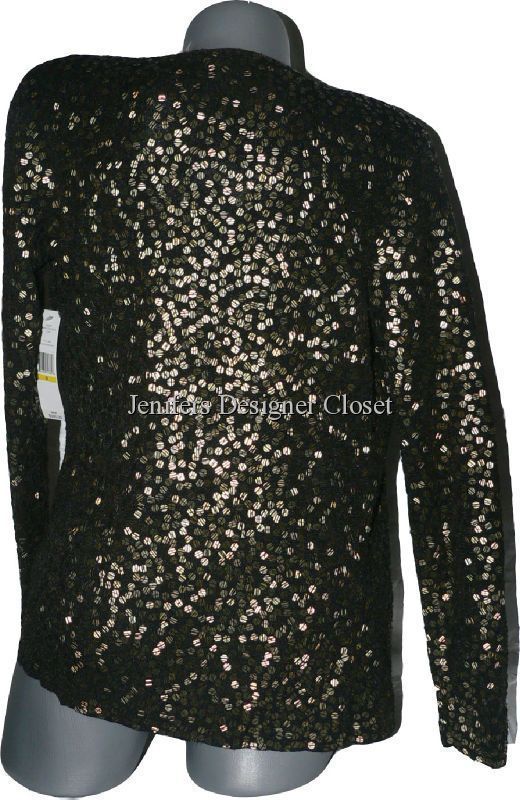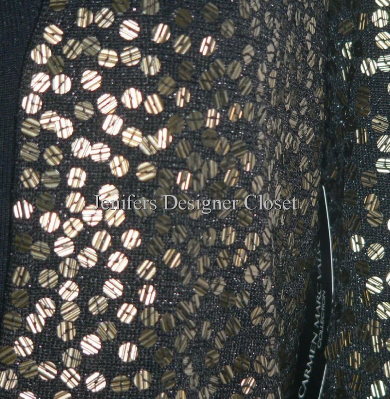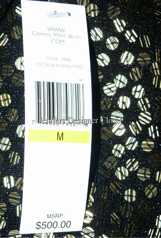 Brand New With Tags designer sweater set by high-end designer CARMEN MARC VALVO. Carmen Marc Valvo designs for the celebrities and Hollywood stars that walk the red carpet. You too can wear the same designs. It is an incredible black with textured matte gold sequins. The sequins are not super shiny like the flash makes them look. They are not flat and slick either. See up close pics to see the detailed lines in the sequins. The sweater retails for $500.00 in the department stores. I am also including a new with tags matching Carmen Marc Valvo solid black tank sweater to wear under the cardigan. Looks awesome with black pants or skirt. Sweater is Size Medium and tank sweater is Size Large. 95% rayon and 5% other fibers. Perfect for a cocktail party or holiday party. Only sold in the highest-end department stores!