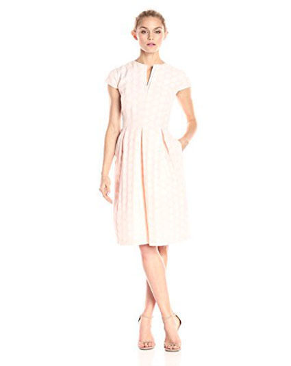 Cap-sleeve dress in fit-and-flare silhouette featuring notched neckline, side pockets, and pleated skirt