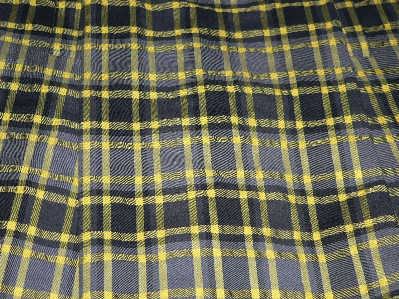 Color- dark charcoal, bright yellow and gray plaid. Has a zipper. Wool; cotton and spandex blend. Heavyweight. Sells for $295.00 in stores. Check out my other high-end designer items too!