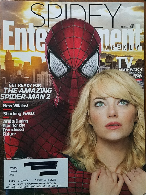 Entertainment Weekly April 4, 2014 issue, features: Andrew Garfield as Spider-Man and Emma Stone as Gwen Stacy in The Amazing Spider-Man 2.